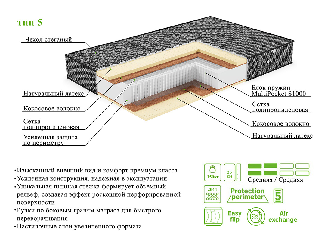 - Вывели анатомические свойства на максимум! Пружинный блок премиум-класса MultiPocket S1000 сочетается с настилочными слоями из латекса и кокосовой койры, что обеспечивает полноценную поддержку всего тела. А стежка и наполнение чехла — это как сотни подушек, которые придают ощущение легкости.
